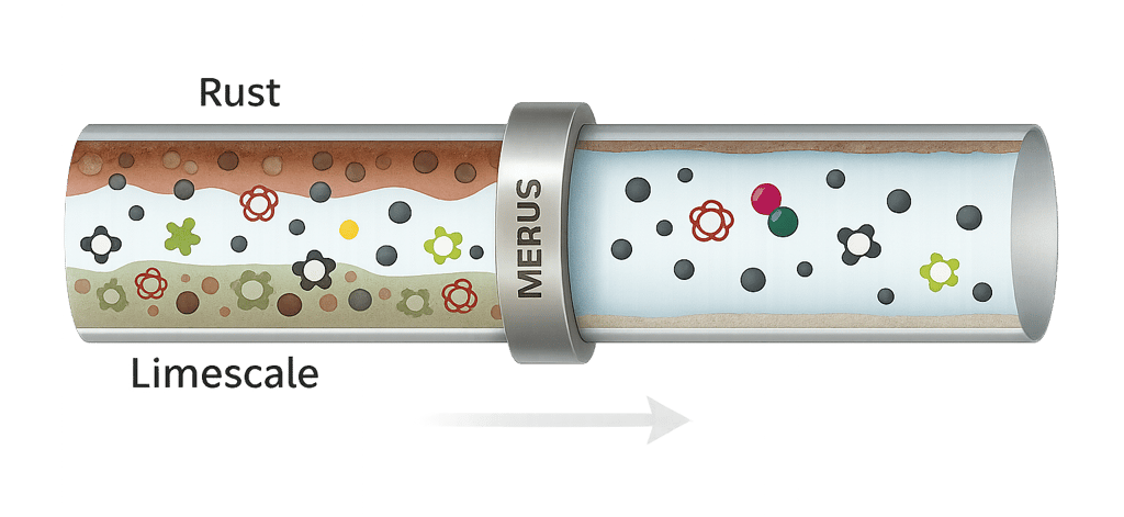 El anillo MERUS emite oscilaciones específicas dentro del agua. Estas debilitan los enlaces que permiten que los minerales, óxidos y microorganismos se adhieran a las superficies.