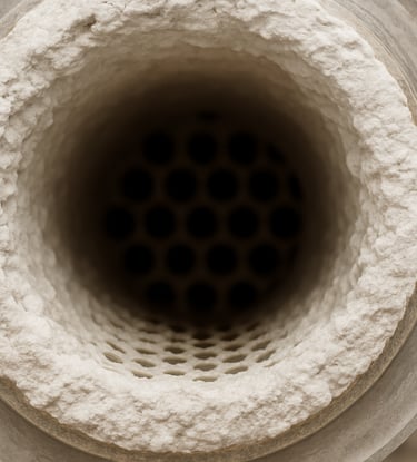 Los minerales disueltos, como el carbonato cálcico, se cristalizan con el tiempo, formando depósitos duros que reducen el flujo y la transferencia térmica.