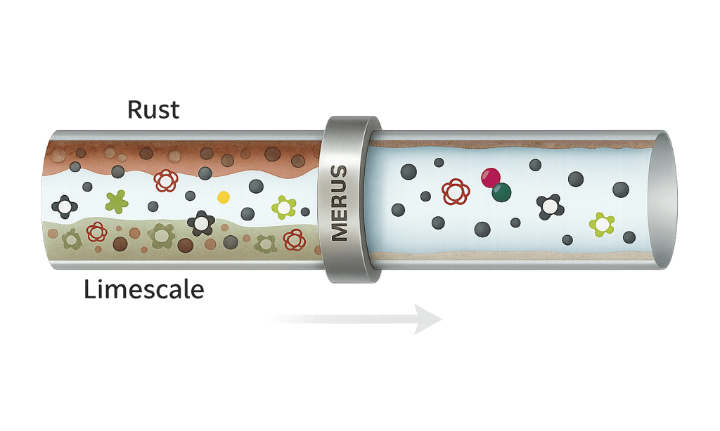 Tratamento físico da água via campos oscilatórios específicos. Instalado externamente à tubulação, o Merus Ring modifica propriedades da água sem contato direto nem aditivos químicos.